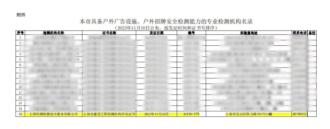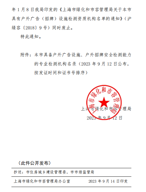 鈞測成功入圍上海市綠化和市容管理局的戶外廣告設施、戶外招牌安全檢測機構名單!